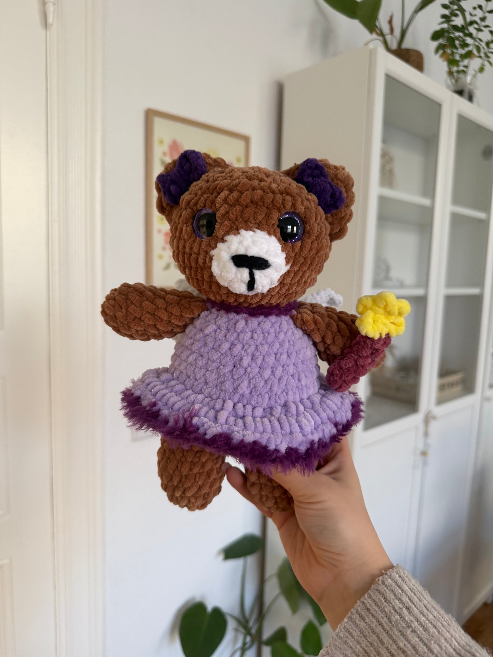 Mit ihrem weichen braunen Fell, dem zarten lila Kleidchen und den liebevollen Details wirkt sie wie eine kleine Waldfee im Bärengewand. Die dunkleren Akzente an Ohren und Saum verleihen ihr eine elegante Tiefe, während ihr kleines Zauberstäbchen sie zu etwas ganz Besonderem macht.