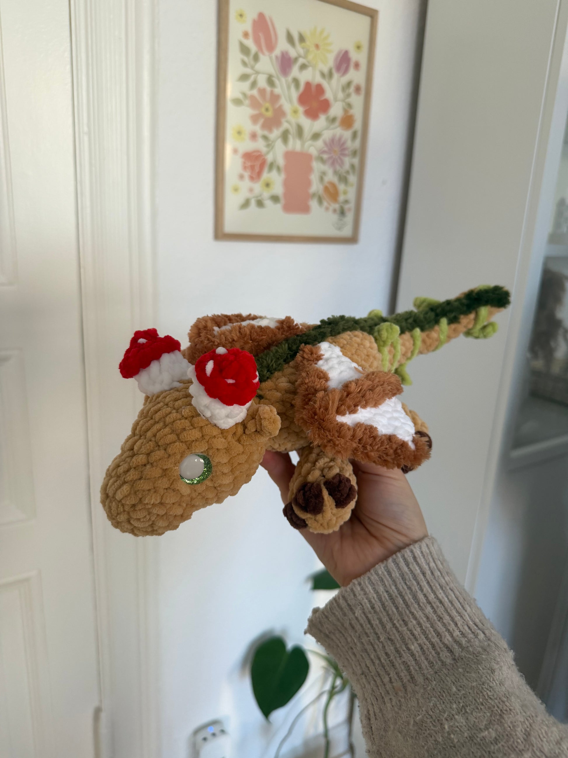Mit seinem warmen Naturbraun, den grünen Akzenten und den kleinen roten Pilzdetails auf dem Kopf wirkt er wie ein Bewohner einer verwunschenen Waldlichtung. Sein langer, liebevoll gestalteter Körper mit kleinen Details macht ihn zu einem ganz besonderen Blickfang.
